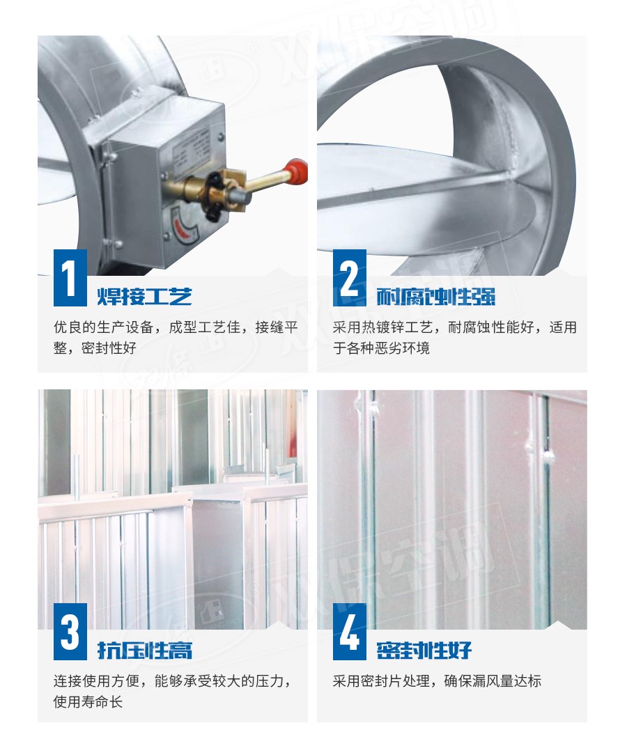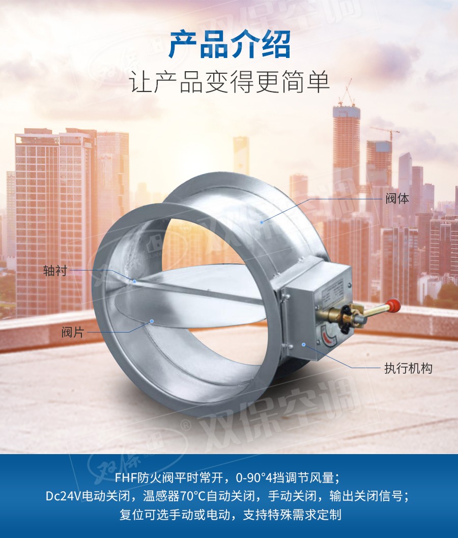 江蘇雙保空調有限公司—防火閥 閥門平時常開,0-90°4擋調節風量; 溫感器70℃自動關閉,手動關閉,輸出關閉信號; 手動復位。