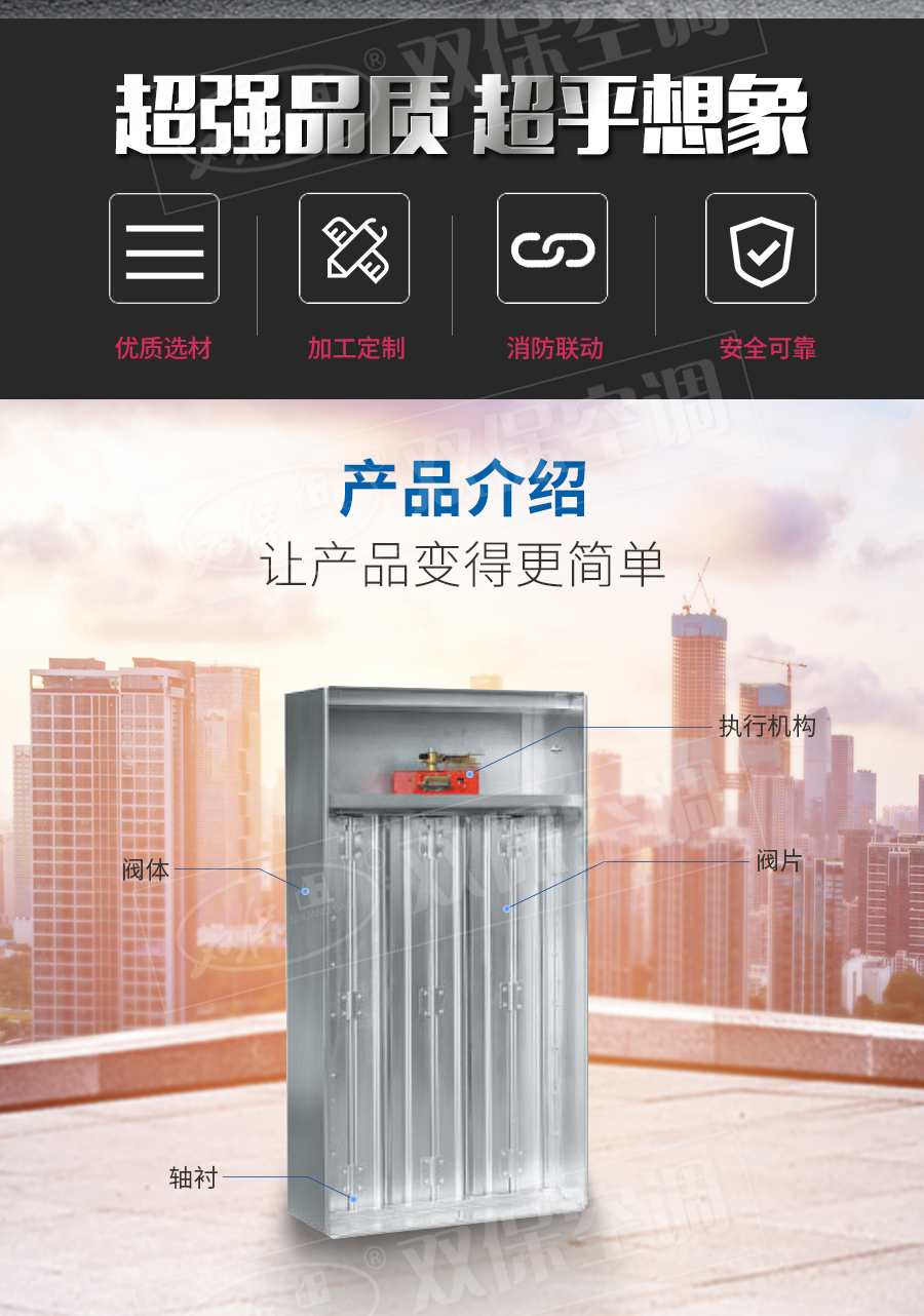 江蘇雙保空調有限公司—多葉排煙口 閥門平時常閉; Dc24V電動開啟,手動開啟,輸出開啟信號; 手動復位。