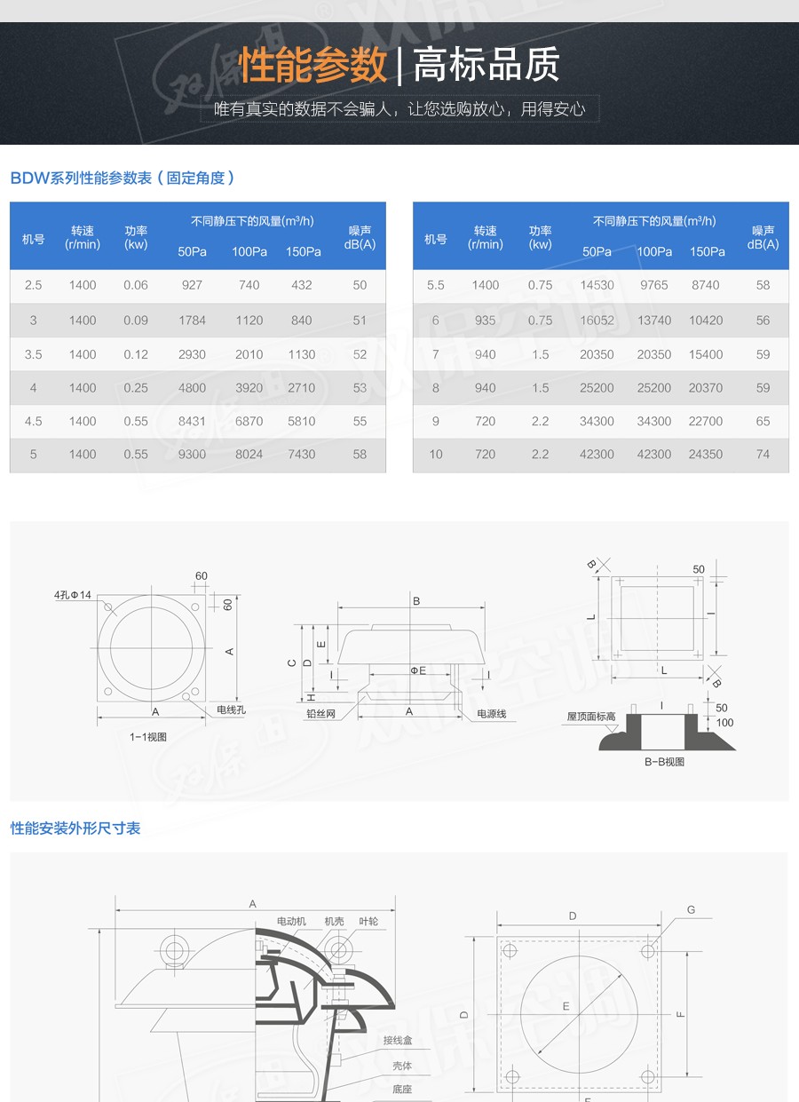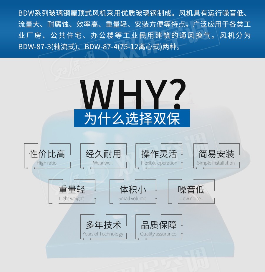 江蘇雙??照{有限公司—BDW系列玻璃鋼屋頂式風機采用優質玻璃鋼制成。風機具有運行噪音低、流量大、耐腐蝕、效率高、重量輕、安裝方便等特點。廣泛應用于各類工業廠房、公共住宅、辦公樓等工業民用建筑的通風換氣。風機分為BDW-87-3(軸流式)、BDW-87-4(75-12離心式)兩種。