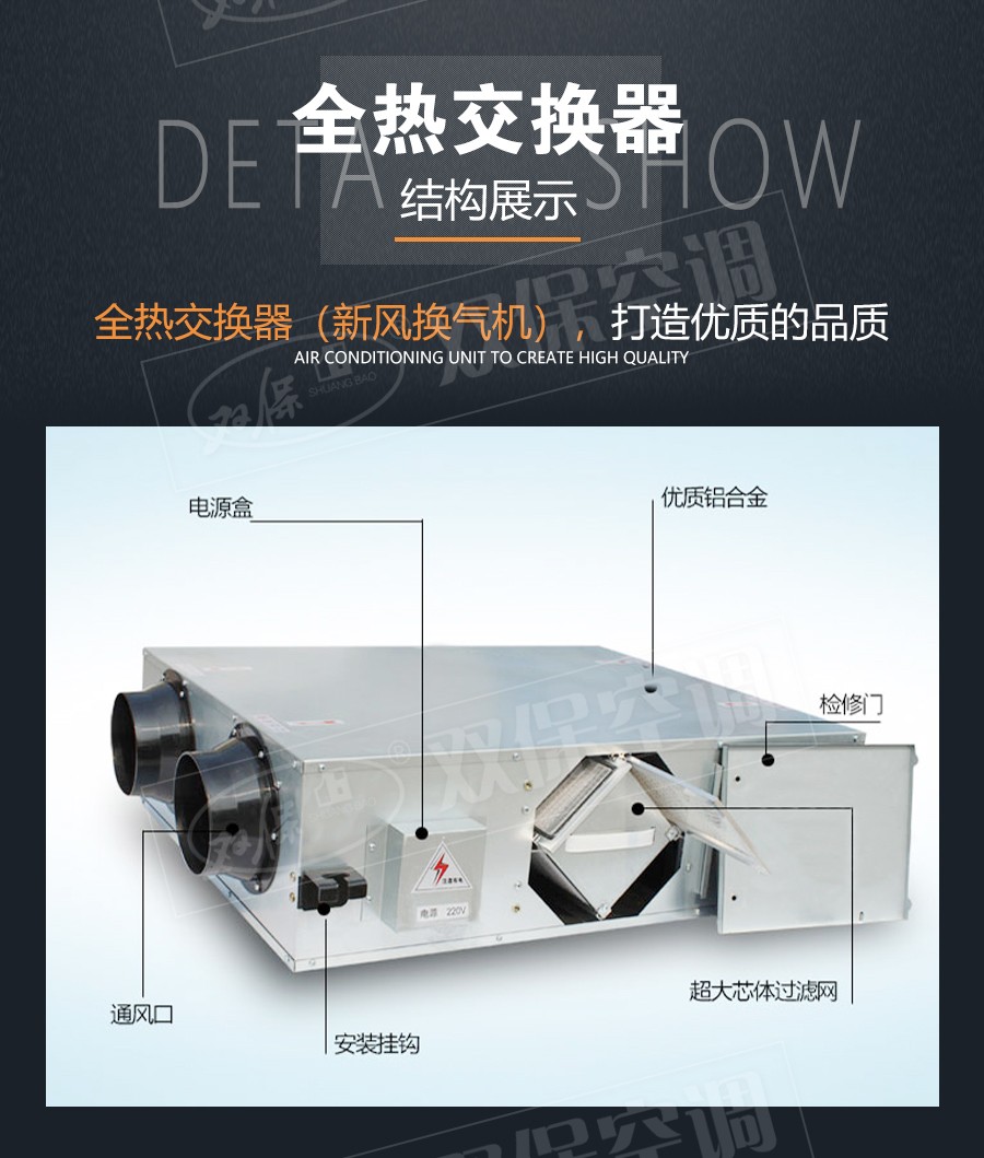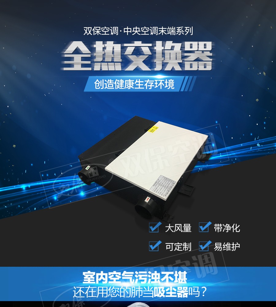 江蘇雙保空調有限公司—全熱交換器是提供新鮮空氣的一種空氣調節設備。功能上按使用環境的要求可以達到恒溫恒濕或者單純提供新鮮空氣。工作原理是在室外抽取新鮮的空氣經過除塵、除濕(或加濕)、降溫(或升溫)等處理后通過風機送到室內,在進入室內空間時替換室內原有的空氣。